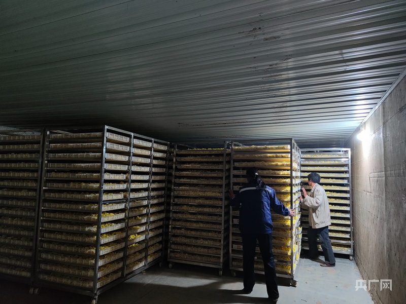 工人将怀菊花送入烘干房进行烘干(央广网发 刘小雪 摄)
