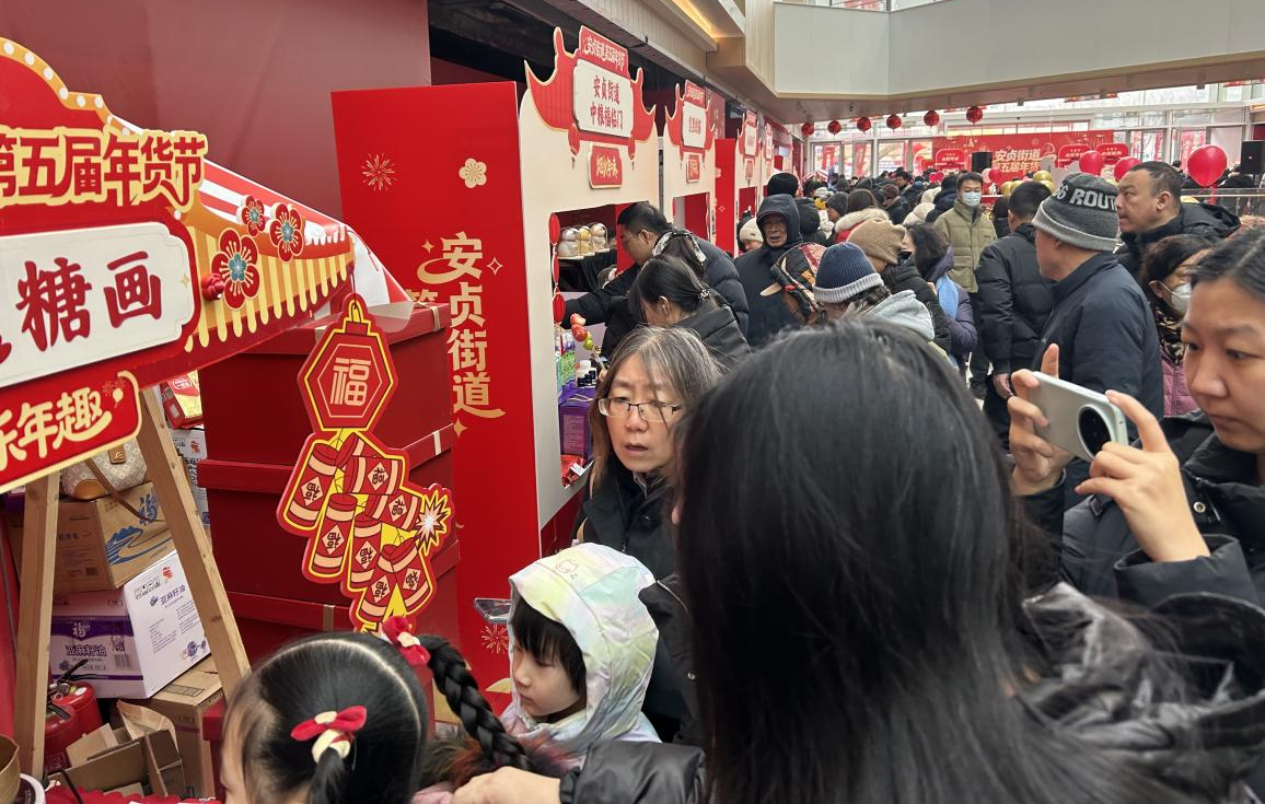 在朝阳区安贞街道举行的年货节现场人头攒动,糖葫芦、糖画、干果蜜饯、鲜切花、百年老字号糕点、腊肠,还有年货节专享折扣的家用电器和电子产品琳琅满目;喜庆热烈的灯笼和春联,更让会场充满了浓浓的年味儿。