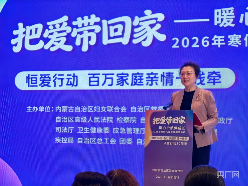 央广网呼和浩特1月9日消息(记者邵玉琴)冬日暖童心,守护伴成长。1月9日上午,由内蒙古自治区妇联等16个部门联合主办的“恒爱行动 百万家庭亲情一线牵”公益行动20周年暨“把爱带回家 暖心护航伴成长”2026年寒假关爱服务活动在呼和浩特温暖启幕。自治区各有关单位相关业务负责人、深耕公益的“爱心妈妈”与受益儿童代表齐聚一堂,共同见证这场跨越二十载的爱心接力,共同开启守护寒假期间儿童关爱的新征程。